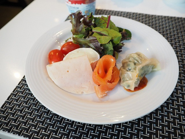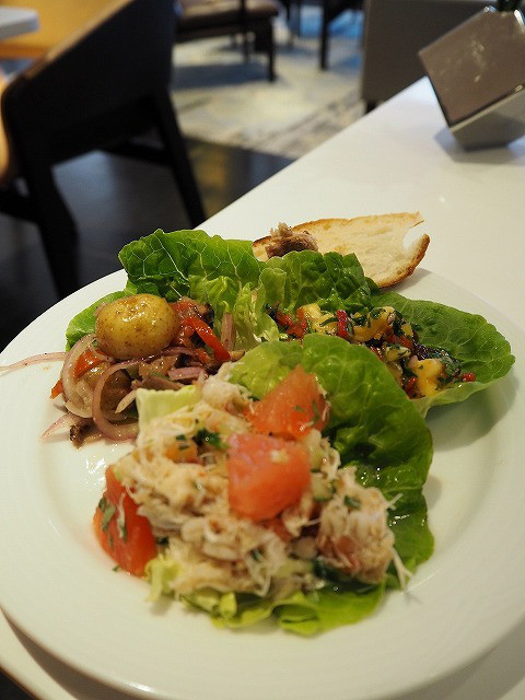 カフェラテをいただきなかがら、ひと時の休息です。4種類をひとつづついただきました。フォッカチャのスモークサーモンサンドもスモークダックのサンドイッチも、適度な塩加減で美味しいものでした。このくらいの種類のほうが、食べ過ぎなくていいかも(笑)と夫婦で話しをしながら、くつろぎました。それにしても、泊まっているお客さんが少ないのか?と思うほど、空いているラウンジでした。お陰で、ゆっくりできるのがよかったです。