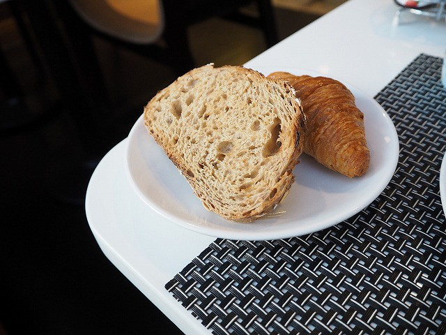 パン類は、焼き立ての香り高いクロワッサンのほか、甘いデニッシュ類もあります。その他、バゲットやカンパーニュなどハード系のパンもあり、こちらを中心にいただきました。