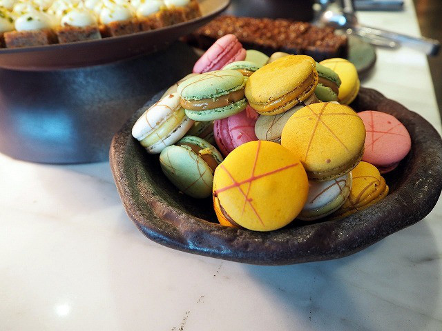 朝食が並んでいた大理石台の上には、カクテルサービスのお料理が並んでいました。前菜からデザートまで幅広いランナップです。アフタヌーンティの時間帯とは打って変わって、品数の多さにびっくり。そして、一番ラウンジ内も混み合っています。朝食もアフタヌーンティもあまりお客さんを見かけなかったのですが、カクテルタイムは、欧米人のお客さん中心で賑わっていました。