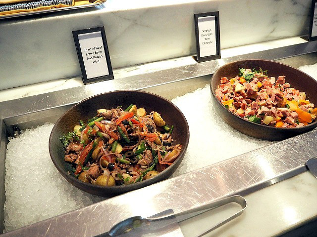 「ヒルトンシンガポール」エグゼクティブラウンジの朝食サービスの様子を紹介します。ラウンジの一角に朝食メニューが並んでいます。コールドミール、ホットミール、パン類など、レストランでいただくのと遜色ない種類のお料理があります。