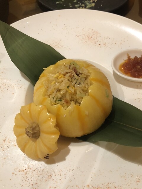 さて、料理ですが、最初に付き出し的にピーナッツ煮が提供されます。北京ダックは予め予約済み、北京ダックは皮だけ、定番の身をクレープに包んで、残った身は炒飯、ヌードル、レタス包、生姜炒めから選びます。生姜炒めにしました。他はメニューから、中国語と英語が併記されていますが、創作系の料理が多く写真も少ないので、何の料理かわからないのが多く…あと、食べたかった点心盛合わせは遅い時間だったのもあり無し、北京ダックのボリューム感も分からなかったので、豆腐とほうれん草と蟹肉の餡掛け、海老マヨらしき…、南瓜の器の炒飯を注文しました。