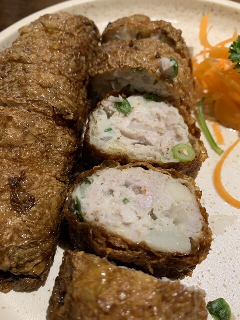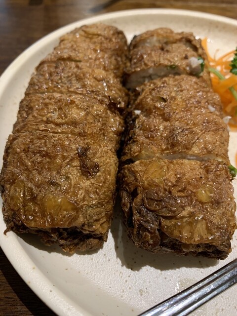 豚の挽肉・海老のすり身・細かく砕いた栗を合わせた餡に五香粉を加え、湯葉で巻いて揚げた逸品。表面はカリカリで中はしっとり。
