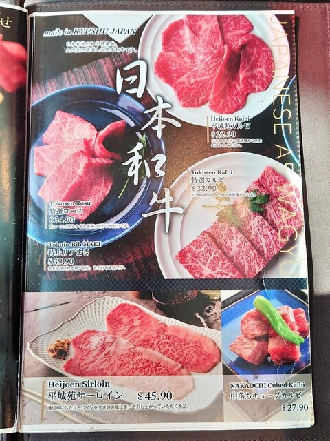 黒を基調としたシックな店内では、おすすめの九州産黒毛和牛をはじめ、リーズナブルな焼物各種、スープやサラダ、ごはんものなどのサイドメニューのほか、90分食べ放題のビュッフェ(Rich Buffet・$55/Premium Wagyu Buffet・$70)、お得なランチが楽しめます。