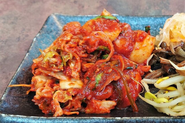 ナムル3種、漬物2種の盛合せ。内容は、もやしナムル、ほうれん草ナムル、ぜんまいナムル、白菜キムチ、大根キムチ。すべて店で手仕込みしているのだそうで、その味も日本さながら。どれもおいしいのでごはんやビールが進みます。