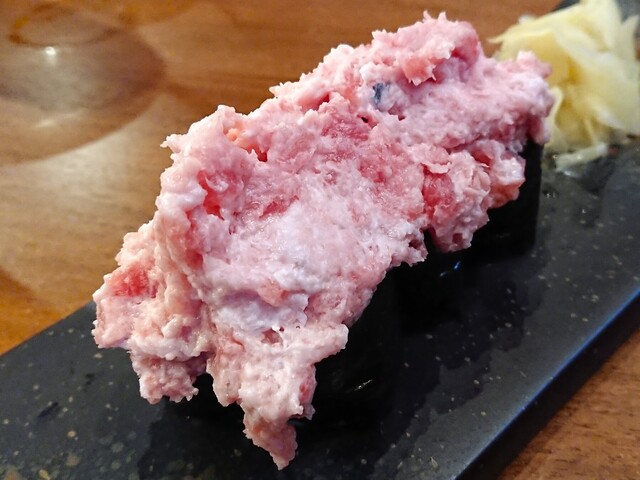 軍艦巻きの上に、脂たっぷりのネギトロをこぼれんばかりにトッピング。不自然な脂がちょいキツめながら、とろけるような食感。