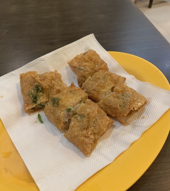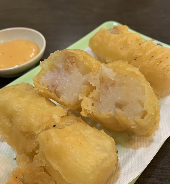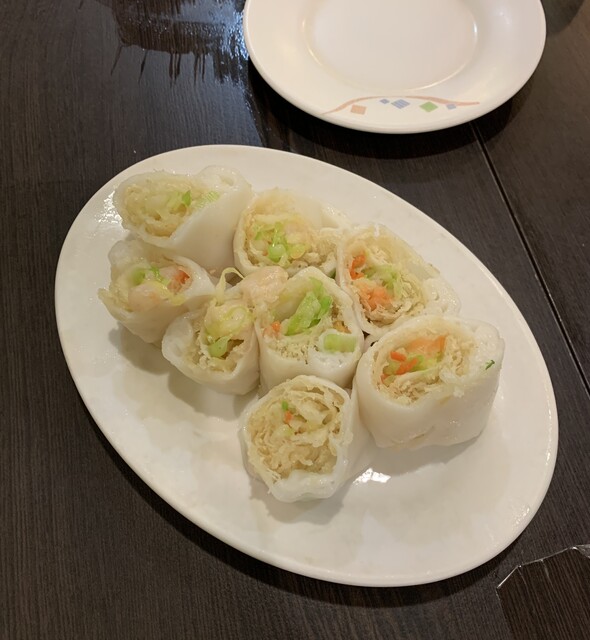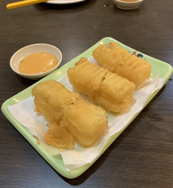 海老と豚肉の餡を湯葉で巻いて油で揚げた春巻き揚げ。こちらも飲茶の定番のお料理ではありますがなんせ味付けが良いので文句なく美味しいです。餡にはパクチーが入っており良いアクセントになっています。