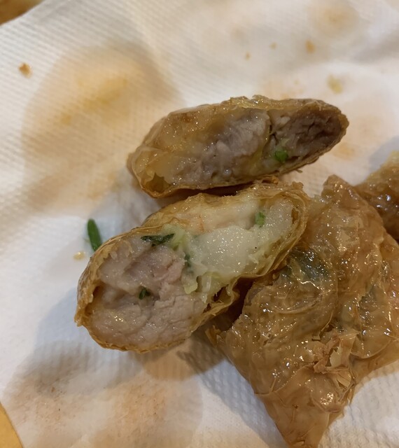 こちらは創作春巻きで皮の内側にはサクサクした揚げ物と野菜が巻かれています。