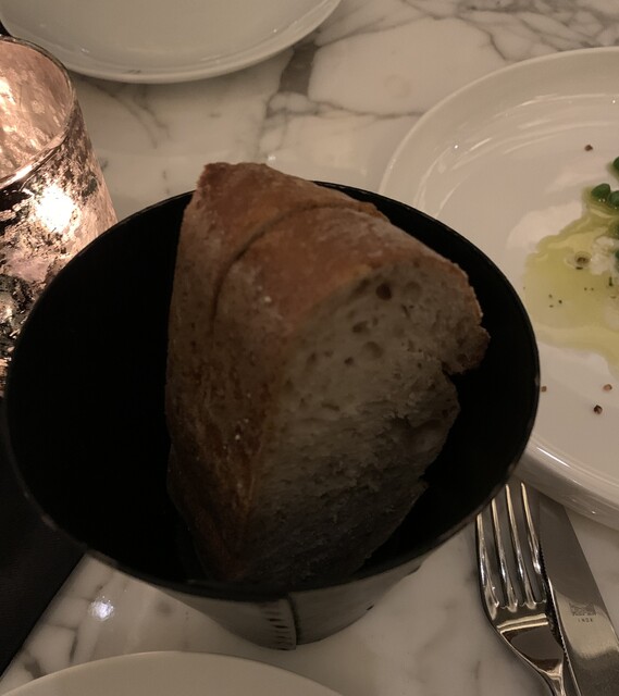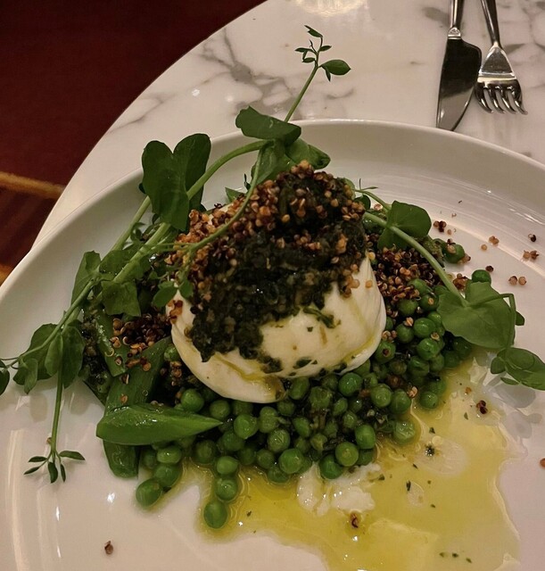 ブラッターチーズに、petits pois(小粒グリンピース)、sugar snap pea(スナップエンドウ)、black garlic pistou(黒ニンニクペースト)、sourdough(サワードウ)が一緒に提供されます。