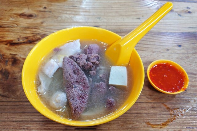 臭みはまったくなく、豚のダシがよく出たあっさり系のスープです。豚ガラやいろいろな部位から出る豚の旨みが溶け込んだスープは、あっさりとしながらも滋味深く、じんわりとしみるような旨さと甘みが感じられます。たっぷり入ったレバーは新鮮そのもの。肉や豆腐には一緒に提供されるチリソースをつけて食べるのもおすすめです。