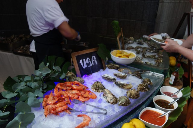 一番人気は牡蠣。アイルランド、フランス、アメリカの3種のご用意。大きな海老も鎮座。