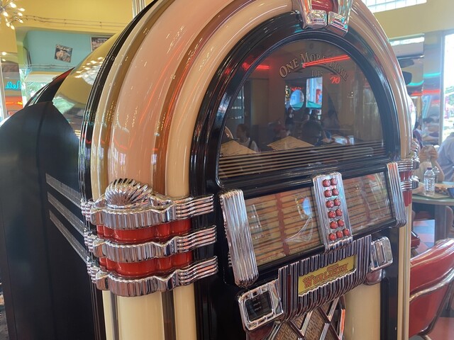 店内中央には昔ながらのジュークボックスとレコードのオブジェがあり、壁には往年の歌手の写真やレコードジャケットなどが飾られ、古き良き時代のアメリカを体現するような風情がある。