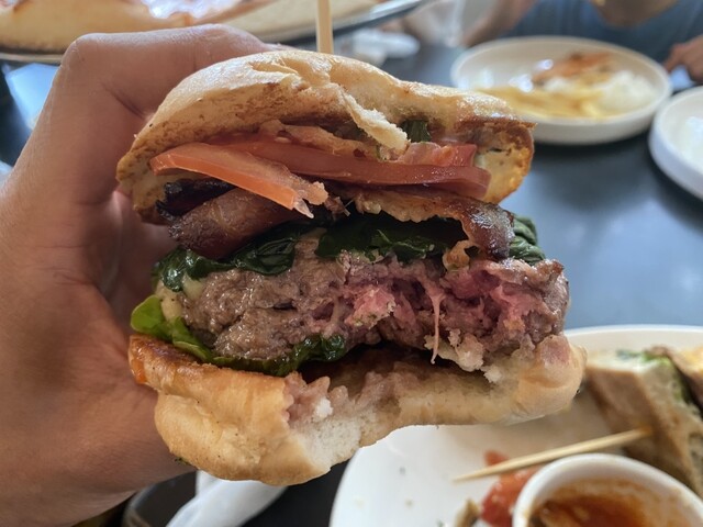 ミディアムレアを指定したハンバーガーを少し味見させてもらうと、牛肉の旨味がストレートに感じられ、かなりおいしい。