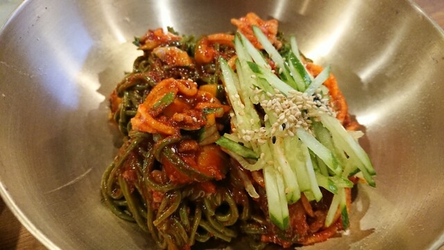 こちらのお店を再訪。頂いたのは前回と同じ、翡翠色のビビン麺と餃子。麺は真っ赤なタレで和えられているが甘みがありそこまで辛くない。それよりも卓上のキムチがかなり辛い。餃子はニンニクが聞いていて美味しい。人気店で時間によっては並ぶが回転が早いのでそこまで待つこともない。ごちそうさまでした。