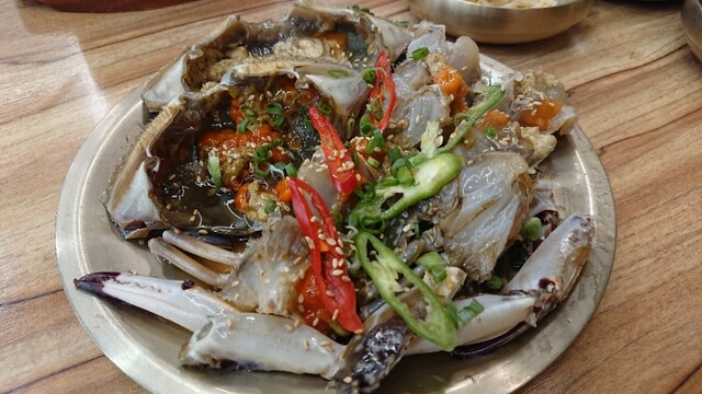 恐ろしいほど前と同じものを注文してしまったが、石焼きビビンバに海鮮チヂミ、カンジャンケジャンにごはんとビール。やはりこちらのケジ...