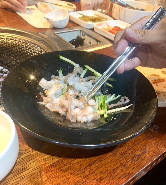 ウネウネで遠慮する人もいる中果敢にチャレンジ...ゴマ油が効いてて、美味いよ?