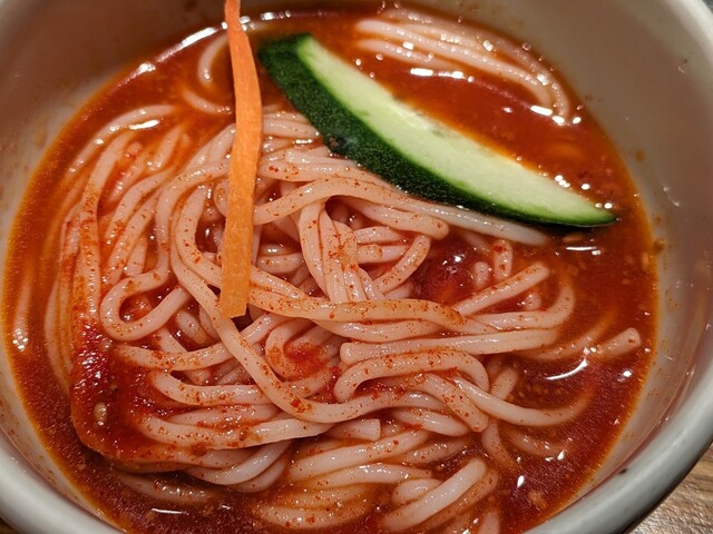 冷麺(?)も付くのですが、これは全然美味しくなかった。茹で過ぎの素麺を辛いタレで和えただけといった方向性の味わいです。