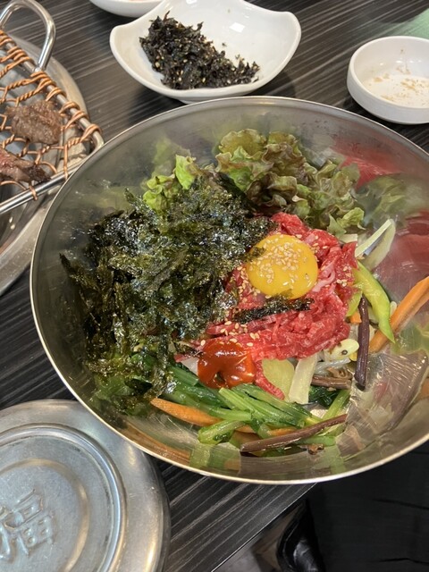 この日も予定変更してコチラへ。予約をしていませんでしたが2階席に入れてもらえました。食べログを見て少し古い口コミしかなかったので心配もありましたが、大正解!他の方が書いてるように少し高いのかも知れませんが、スタッフの方が上手に焼いてくれます。韓牛盛り合わせに塩タンとユッケビビンバとビールを注文。とっても美味しかったので、また行きたいです。