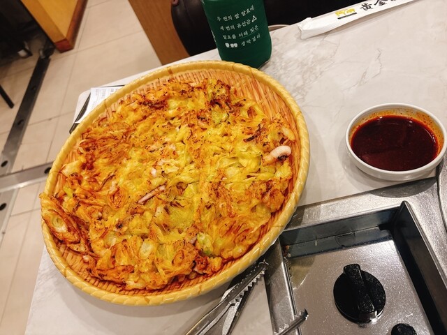 チヂミは普段の想像してるチヂミとは違いましためちゃくちゃでかいしなんか軽いです。野菜がかなり多いけどサクサクしてます。