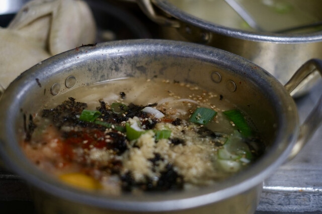 そしてアルミ鍋で提供されるスープが旨いのなんのって!まるでスノードームのようにマヌル(にんにく)が舞うそれは背徳の向こう側。そしてカタクチイワシを24時間煮込んでとったという、ダシが効いたスープが染みわたる手打ち麺「カルグクス」も絶品。