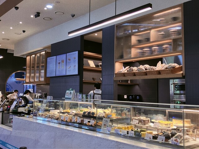 手前はいわゆるスターバックスのレジとカフェ。通常のコーヒーメニューはここのレジの奥で作って提供され、パンやスイーツもこちらで購入する。