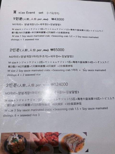 カンジャンケジャンの定番セットメニューをオーダーした。カンジャンケジャン以外にもいろんな韓国料理が試せてよかった。