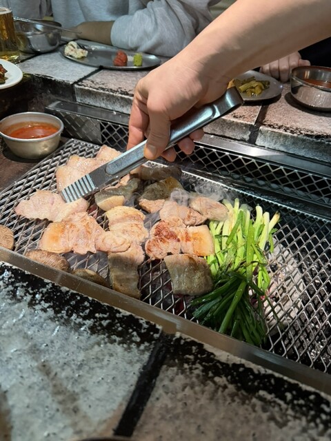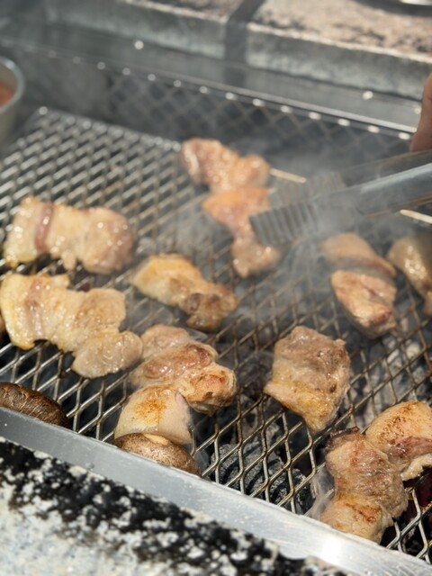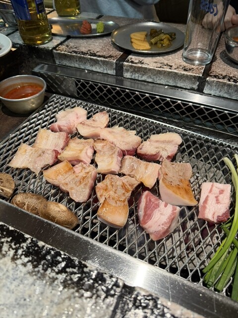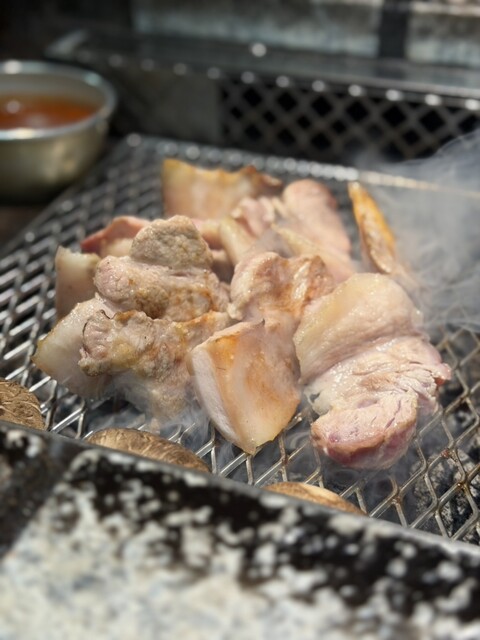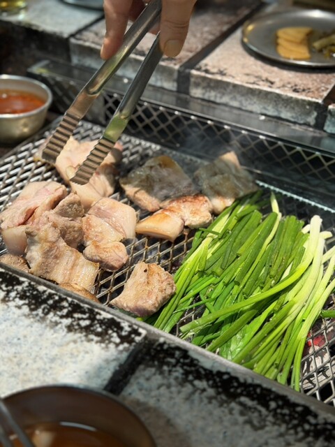黒豚を炭火焼きし、脂を染み込ませながら一緒に焼いたタテギとともに塩パラ山葵で食べたら、脂身がチョンマルマシイッソヨ!ペロッとなくなった!