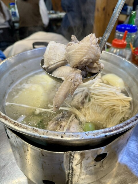 こちらの「東大門明洞タッカンマリ」では韓国で韓方薬に良く用いられる針桐(ハリギリ)をメインに、タッパル(鶏足)、ニンニク、生姜、野菜などで煮込んだスープで煮込んでいる。タレをつけなくてもほんのりと塩味があり、煮込めば煮込むほぶつ切り鶏からダシが出て、味が濃厚になっていく。