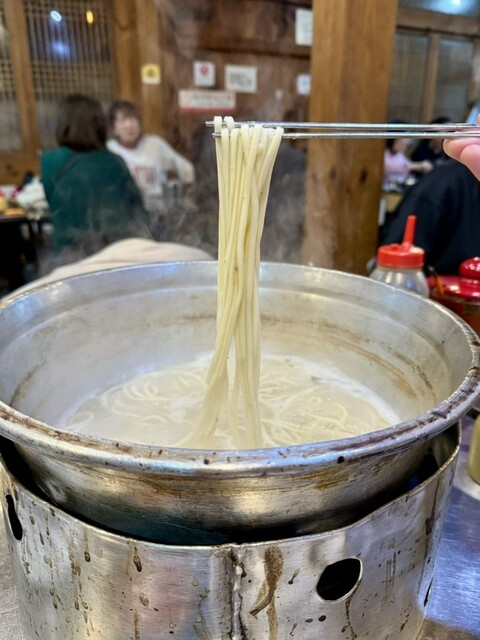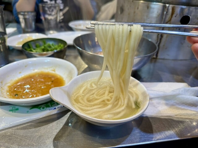 締めは韓国手打ち麺(カルグクスサリ)が定番で、鶏のダシが存分に煮出たスープを余すところなくいただく。カルグクスは小麦粉を原料とする平麺で、かんすいは入っていないので中華麺よりもうどんに近い。
