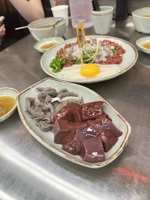 動くタコ足と新鮮な牛ユッケ美味