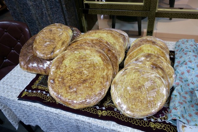 レピョーシカはロシア語で「平たいパン」という意味でウズベキスタン語で言う「ノン(non)」と同じくタンドールで焼いた平パンを指すようだ。中央アジアでは定番の食事パン。平べったいとはいえ手のひら3つ分ぐらいあるボリューム。表面はパリッとしているが中は水分が少なくてモサモサする。スープ(シュルパ)とか煮込み料理とか汁気の多い料理と一緒に食べるものなんだろうな。