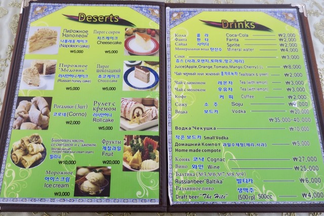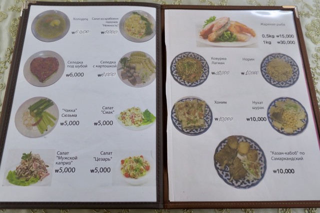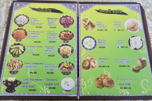 ビールとレピョーシカ(パン)、シャシリク(串焼き)をオーダーした後に、店員さんがサラダなどの冷菜のお皿を色々乗せたワゴンをこちらに見せに来てくれた。隣の「Samarkand City」では小鉢の人参サラダが無料のお通しとして出てきたから、こちらも同じシステムかなと思ったので、せっかく無料なら・・・と一番豪華そうなサラミとチーズの盛り合わせを選んだけど、普通に有料メニューだった。手元のメニューブックにも載ってた「ミートアソート」で15000₩(約1500円)。一番高いやつ選んじゃったな。サラダ類だったら4000₩程度だったみたい。