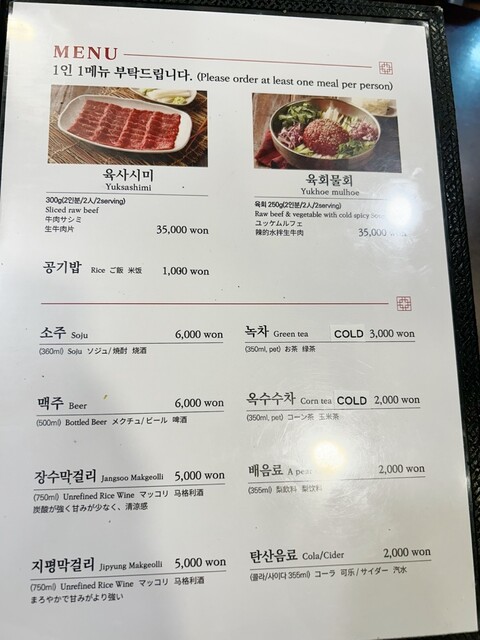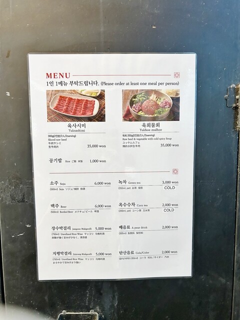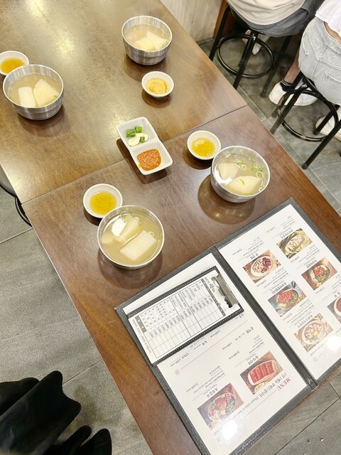 サービスの大根、牛肉スープ、キムチ、ユッケビビンパのセットで10,000ウォン(日本円1,000円)破格!!!