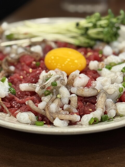 我々はつい先程近くの『兄弟ユッケ』でレバ刺しを堪能したので、今回はタコとユッケの一皿を。