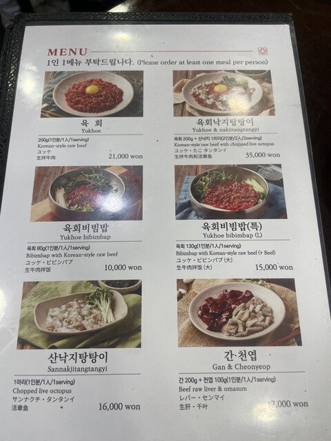 店内は地元の方や観光客でにぎわっていました。今回はレバー、センマイ、ユッケビビンバ、生牛肉を注文。どれも新鮮そのもので臭みが一切なく、まさに本場の味!特にユッケビビンバはお肉の旨味とタレのバランスが抜群で、混ぜるたびに味が深まっていく感じがたまりません。レバーとセンマイもとろけるような食感で、苦手な方でも食べやすいと思います。評判通りどれも本当に美味しく、大満足の一食でした。ソウルに行ったら絶対にまた行きたいお店です。