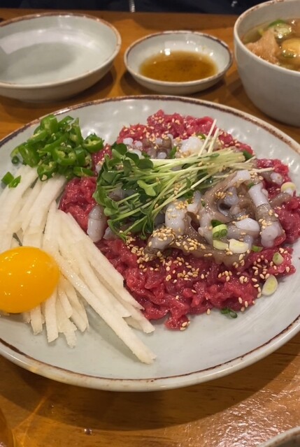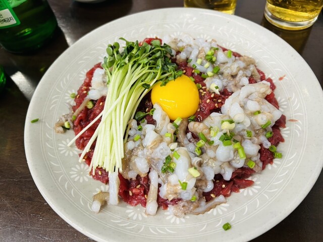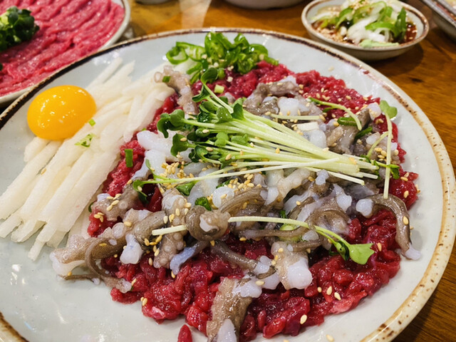 ユッケと動くタコのを合わせた料理で、口の中でタコがくっつく感じは初体験でしたが、韓国のユッケは美味しい。