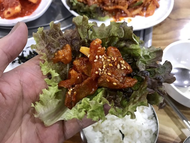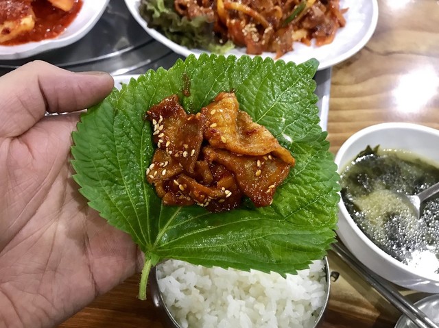 テーブルにメインの豚肉炒め以外にキムチやカクテキ、韓国海苔にサムジャン(辛味噌)などが並べられる。包む用の野菜はサンチュやエゴマの葉の他に日本では見たことないような巨大な三つ葉やワサビ菜のような野菜など色々付いてくる。ボリューム満点で日本円で約700円ならかなりお得感がある。