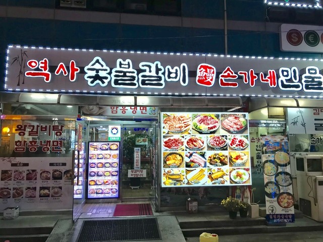 東大門のショッピングビル「LOTTE FITIN」の裏通りの賑やかな商店街沿いにある「동대문역사숯불갈비(東大門歴史炭火カルビ)」へ。飲食店が並ぶ通り人通りの多い場所にある焼肉店。