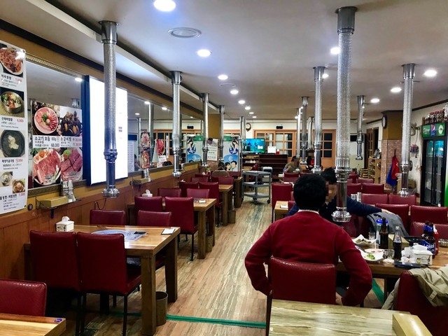 この日は残業で夜遅くなって平日23時前に訪問。ラストオーダー直前なので店内はガラガラだった。この時間から焼肉の気分でもないので「제육쌈밥(豚肉サンパプ)」(7000₩)をオーダー。サン(包む)、パプ(ご飯)でコチュジャンで味付けした豚肉炒めとご飯を一緒に葉野菜で包んで食べる定食セット。