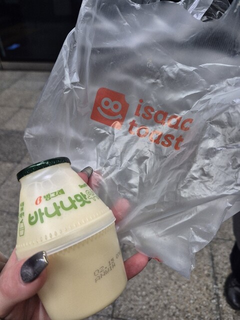 極寒の朝の韓国で幸せを感じられるあったかトースト、最高でした!近くのコンビニで買ったバナナウユと一緒に♡ご馳走さまでした!