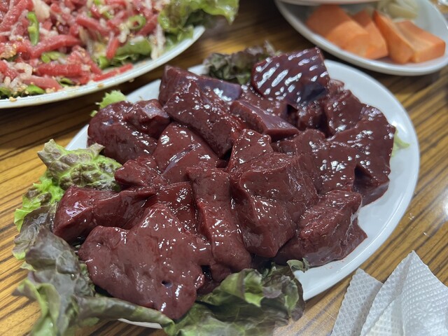 日本では食べれない生食の牛レバー。ぷりぷりで臭みなく甘い。