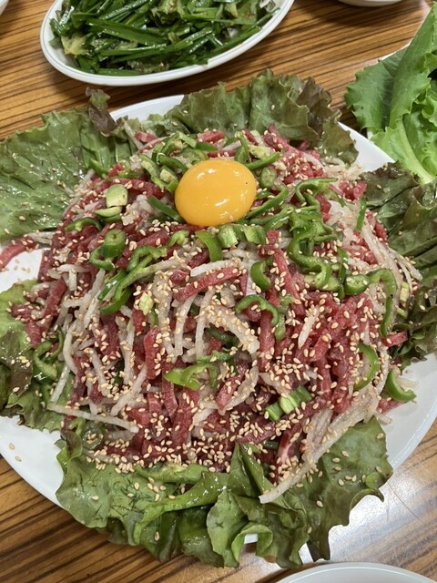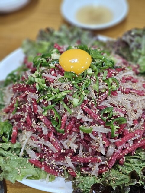 本場のユッケはかなりのデカ盛りでした。細く刻まれたナシと新鮮な牛肉のコラボレーション。かなり甘めの味付けですが、輪切りの辛くない青唐辛子のような野菜がアクセントになり、スイスイ食べられます。
