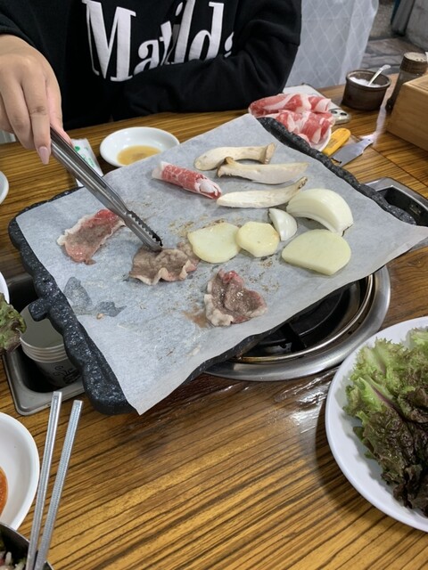 ココは店員さんが作ってくれることはなく、自分でサムギョプサルを焼くスタイル...