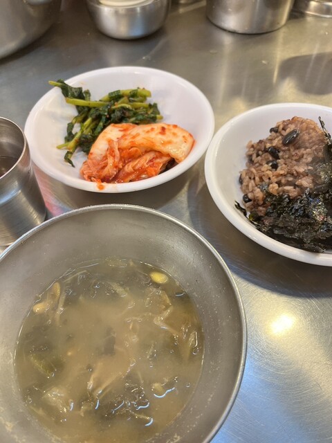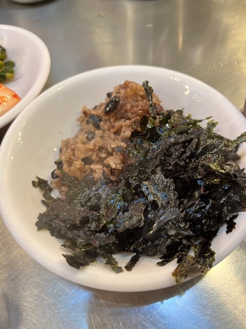 着席すると味噌汁とキムチが出てきて、麦飯とキムチやナムルを混ぜてピビンパにして食べます。ゆで卵が乗ったミニビビン麺は甘めの味付けが特徴でした。追加サービスで찰밥(おこわご飯)も登場。細かく刻んだ海苔が添えられていて、ごま油が香る海苔と一緒に食べます。