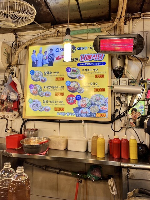 カウンターのみ10席ほどで、既に日本人観光客が1組座っていました。メニューはセットのみ。不思議なのは、칼국수+냉면(冷麺)に보리밥(麦飯)がついても同額。どうやら量が調整されているみたい。된장국(味噌汁)と김치(キムチ)までついて₩9,000。