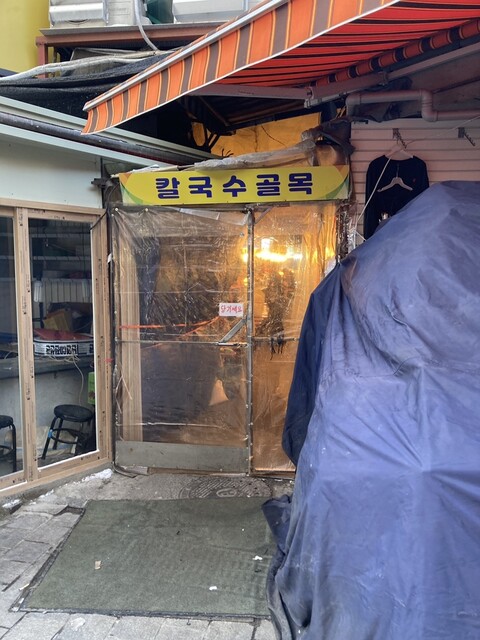 地下鉄4号線の会賢駅の5番出口から出て、南大門市場のメインストリートに入って20mくらい進むと左手にあるビニールの扉と칼국수골목(カルグクス通り)の看板があります。週末の午前8時半に訪問しました。