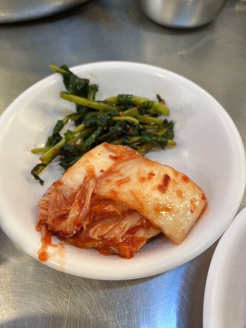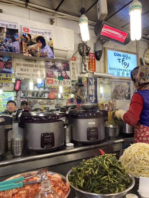 突き当たりまで進む間にカバンまで掴まれる始末。でも強い信念を持って自分で選択することに。知人がフォロワーが多いYouTuberが宣伝していたことを知っていたのでこちらのお店に決定。カウンターに自家製のナムルやキムチが並んでいます。