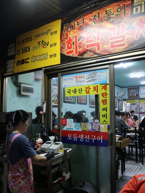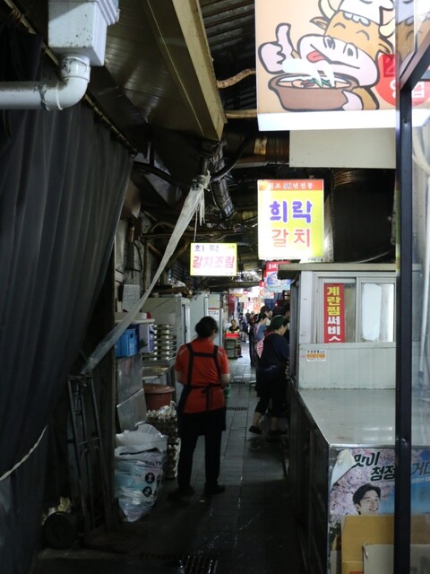 この日はブランチに、南大門市場にあるカルチジョリム横丁にて「カルチジョリム (太刀魚の煮付け) 갈치조림 」をいただきました。いただくのは以前、チェジュでいただいて以来です。煮汁は少し辛めです。相変わらず、太刀魚の食べ方の流儀をわかっていないので、うまく小骨を避けられません。イモニムに”찍어도 돼요?” と聞くと快く”네”と返してくれました。 Youtubeで見つけたお店ですが、文在寅大統領も食べに来たお店で、正午をすぎると多くの韓国人で賑わっていました。
