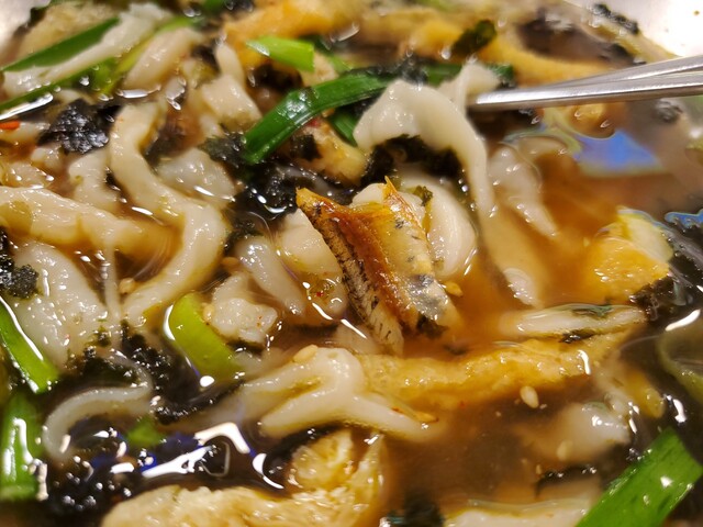 まずはスープをひと口。カタクチイワシを基本に昆布、ネギ、大根、唐辛子などを加え、数時間かけて煮込まれたというスープは、ちょっと塩味が強めです。