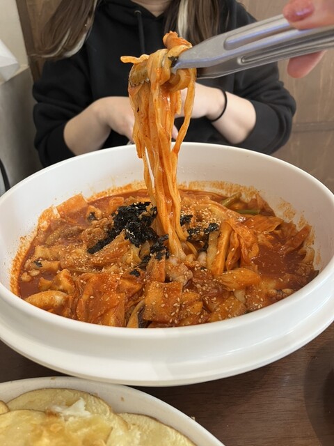 カルグクス、洗面器みたいなでかさの器にきました。タコいっぱい、優しい辛さです。うどん、コシはなく食べやすい。甘いのでスルスル進みます。けど具材がいっぱいやから、苦労しました。