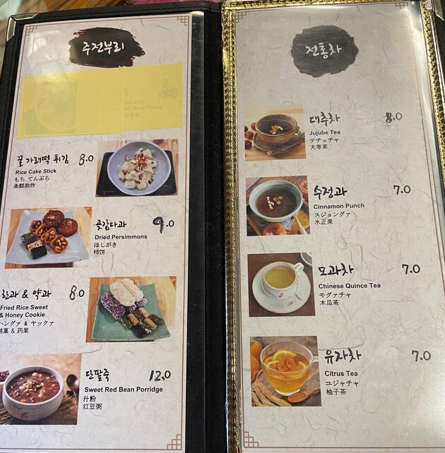 小腹が空いたので休憩のために利用で頂いたのは、蜂蜜餅焼き8000ウォン、汁粉12000ウォン、ナツメ茶8000ウォン、水正果7000ウォンです。
